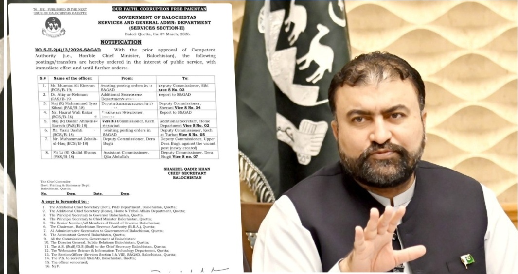 According to the notification released by Chief Secretary Balochistan Shakeel Qadir Khan, the transfers have been made with the approval of Chief Minister Mir Sarfraz Bugti.
