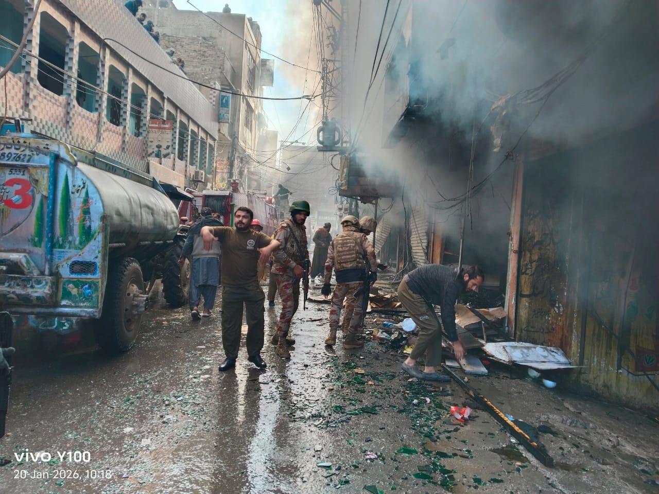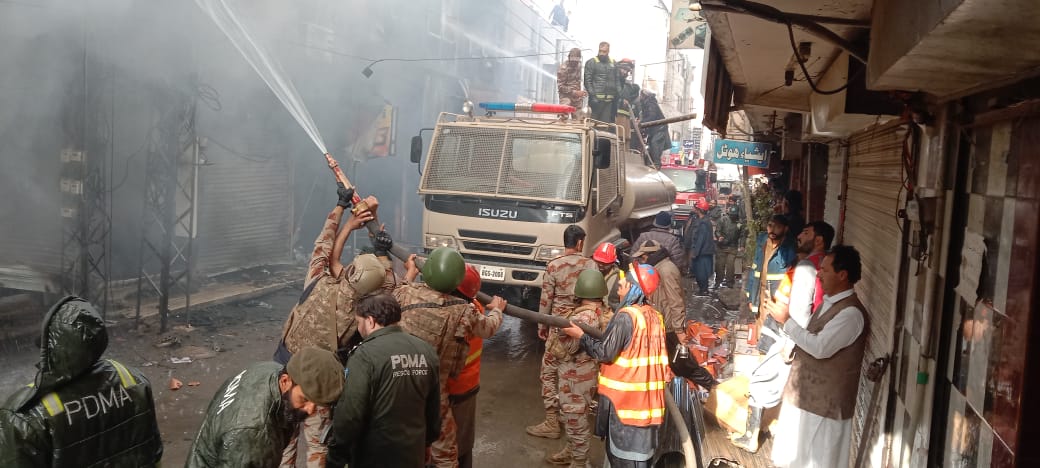 Rescue officials said the plaza, known as Achakzai Plaza, houses computer, mobile phone, garments and other retail outlets, raising concerns over significant financial losses. No casualties have been reported so far.