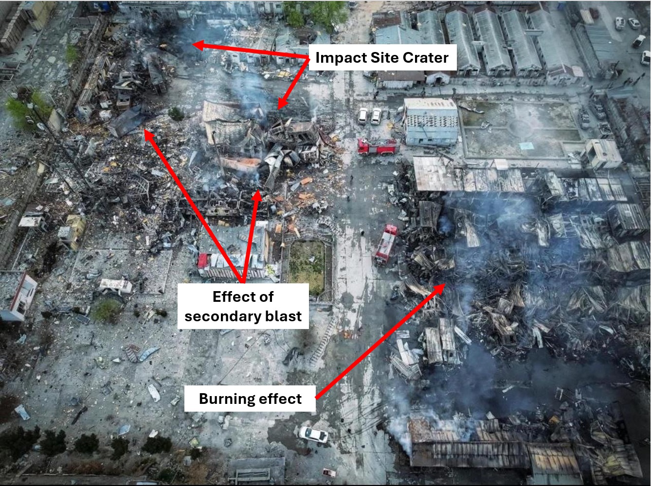 Investigators noted there was no evidence of a direct strike on the alleged hospital. The fires and damage resulted from secondary explosions after the detonation of stored weapons.